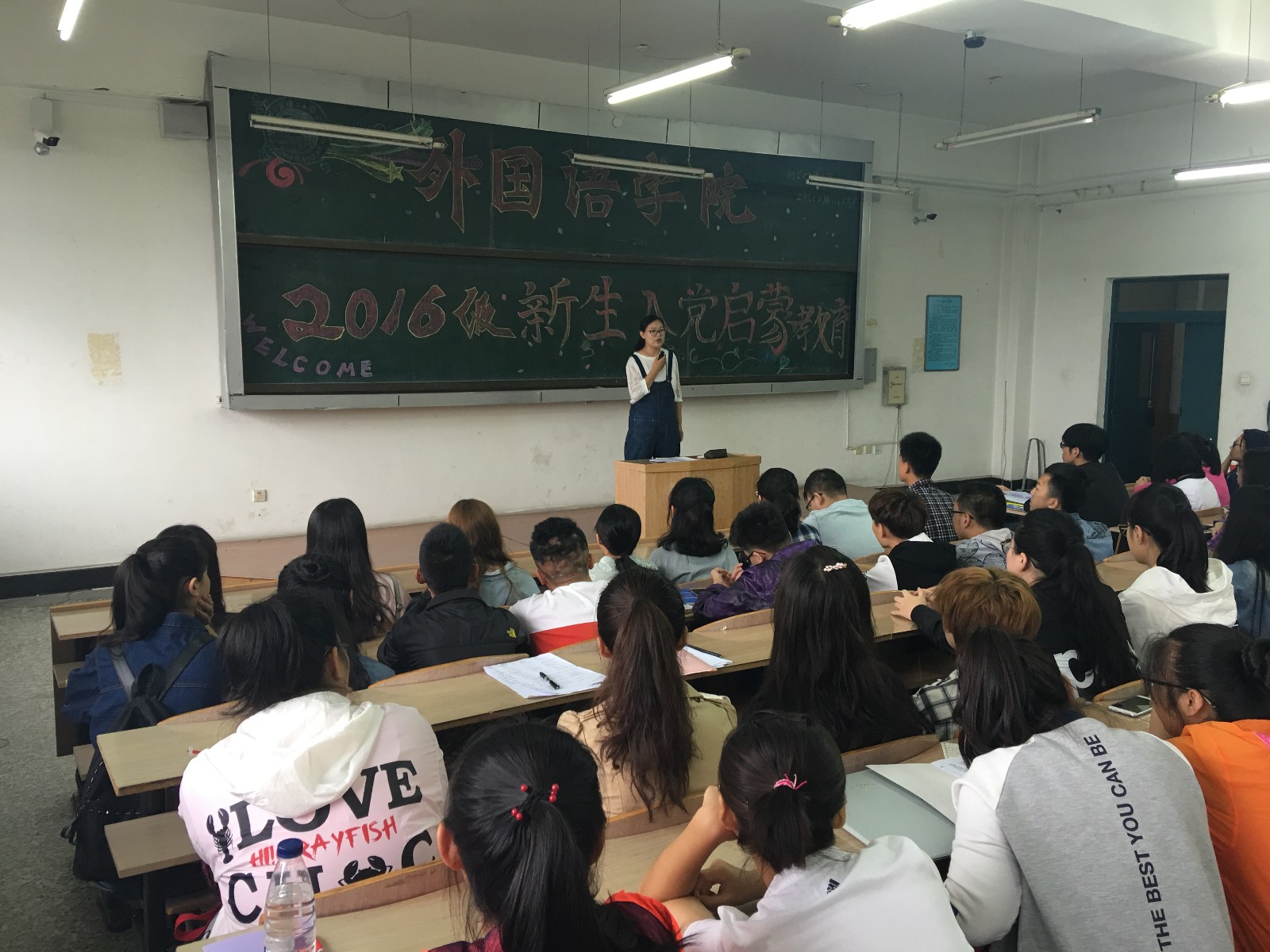 外国语学院党务工作负责辅导员李竖新老师,对2016级新生进行了入党启蒙教育,这也是外国语学院党委和学生工作人员将“两学一做”学习成果落到实处的心得举措。李老师向全体新生介绍了党的基本理论知识和学生党员组织发展程序,并组织大家学习了我校发展学生党员的相关制度。使2016级学生在思想上、行动上、政治上向党中央更靠近一步,使中国特色社会主义的共同理想和共产主义的远大理想在2016级学生的思想中萌发。