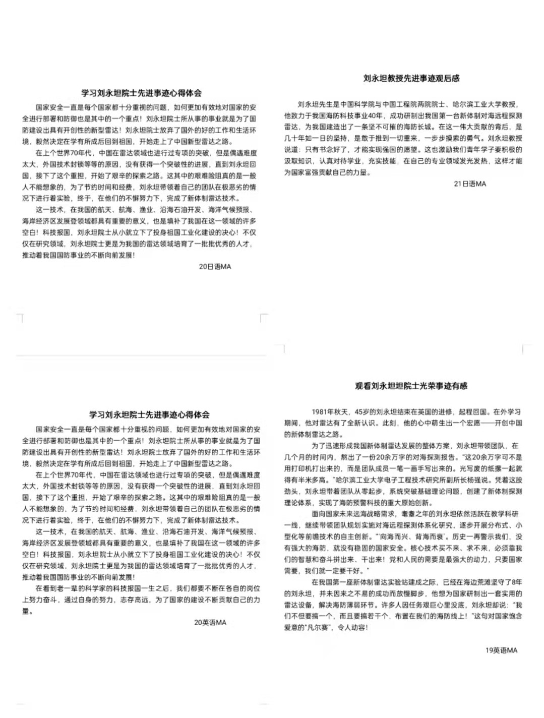 “在坦先生身上,我感受到了一名共产党员奉献牺牲、开拓进取的伟大品格,从坦先生的事迹中我深受颇深。”有同学说,作为新时代的青年学子,要爱国爱党,锤炼品德,在攀登知识高峰中追求卓越,在肩负时代重任时行胜于言,让青春之花绽放在祖国最需要的地方,努力成为新时代本领过硬、敢为人先的优秀青年!刘永坦院士心系海防,坚守初心,用他自己的一生为我国的国防事业作出了巨大的贡献,党员们也表示在今后的学习工作中自觉以刘永坦院士为精神旗帜和奋斗标杆,为社会发展做出自己的一份贡献!