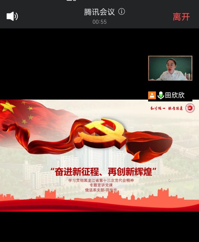 俄语系党支部书记田欣欣从“深刻领会省第十三次党代会的丰富内涵”层面进行党课解读,并提出对党员的新要求:“要高举旗帜,把握方向、明确目标,要始终弘扬党代会精神,从百年党史中汲取智慧和力量,大力弘扬东北抗联精神、大庆精神(铁人精神)、北大荒精神,认真践行以人民为中心的发展思想,坚定信念、开拓创新、担当奉献,发展一方经济、服务一方百姓、守护一方平安,切实做到为党分忧、为国尽责、为民造福,以辛苦付出赢得振兴发展成效,用拼搏实干换来人民幸福生活,靠持续奋斗成就龙江美好未来,为实现中华民族伟大复兴的中国梦,作出龙江人的贡献。”