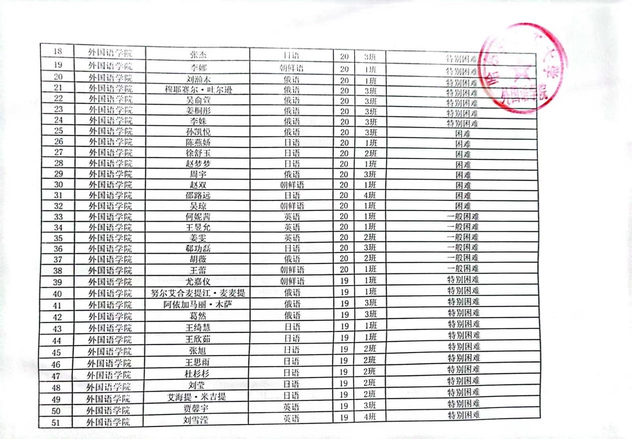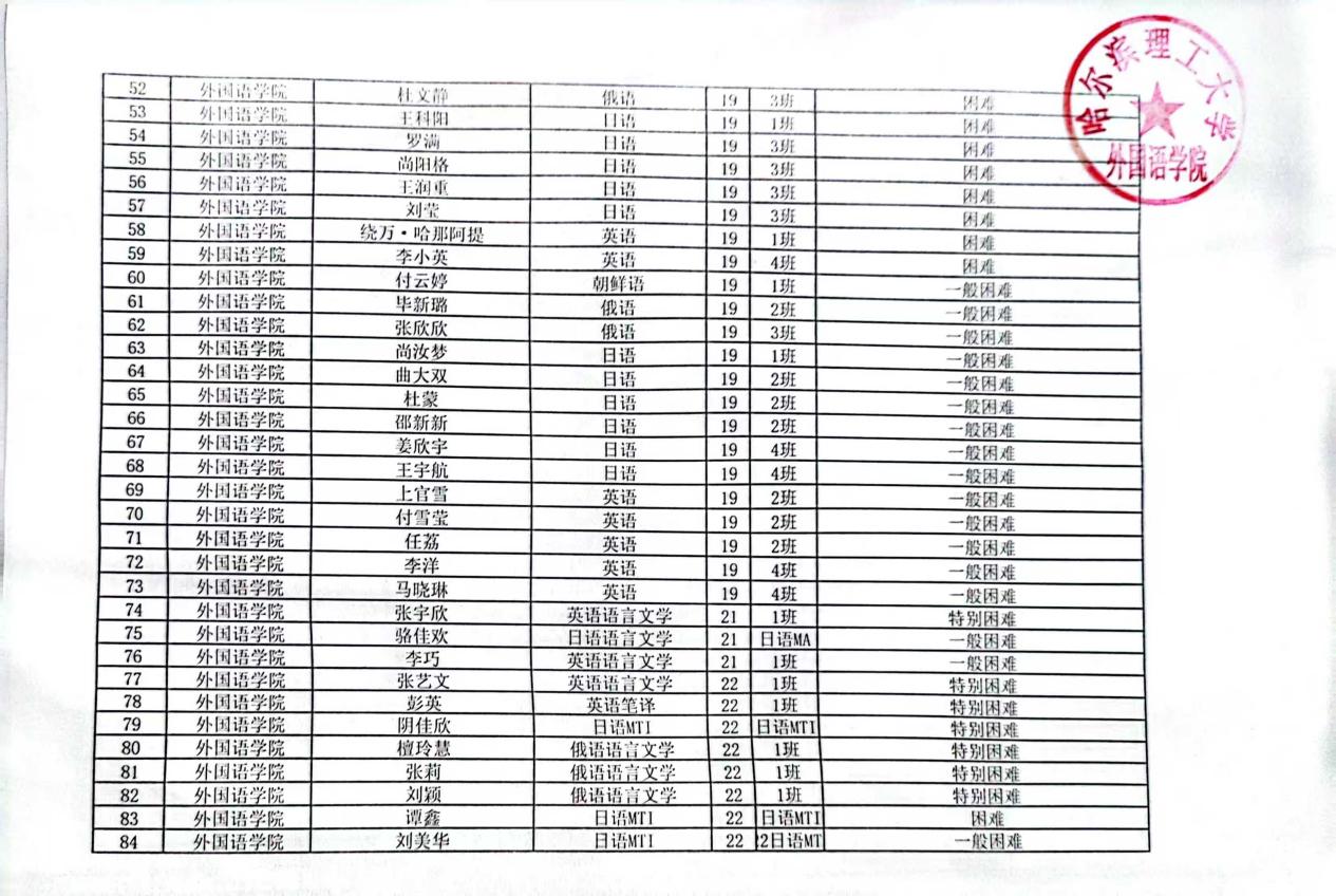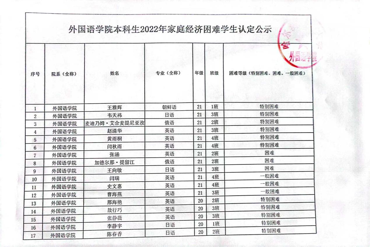 按照《关于开展2022年家庭经济困难学生认定工作的通知》要求,经个人申报、班级评定小组初审、学院复审、拟认定84名同学为家庭经济困难学生,人选名单见附件。对拟推荐人选如有异议,可在公示期内反映,反映情况和问题必须实事求是,应签署或告知真实姓名、班级和联系方式;对线索不清的匿名信和匿名电话,公示期间不予受理。公示时间:10月11日至10月15日受理电话:86392912外国语学院2022年10月10日