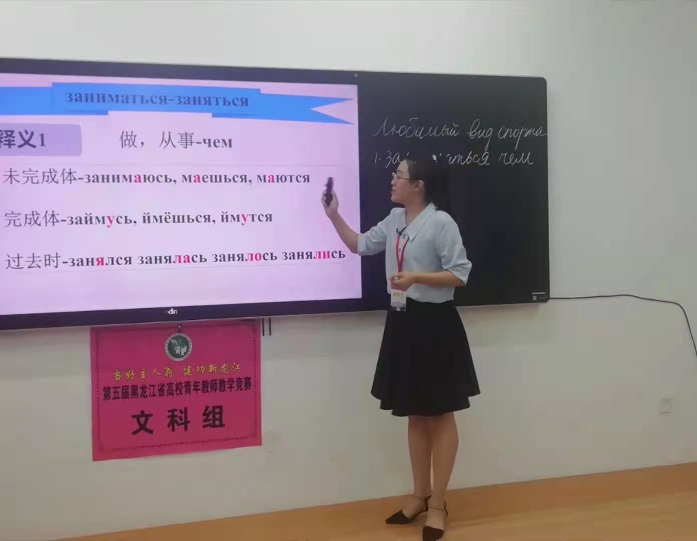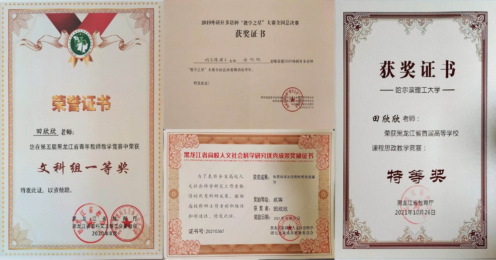 20196月,田欣欣被选为文科组参赛代表参加黑龙江省高校第五届青年教师教学竞赛,20个课件,400页的教案,400分钟的课堂讲授,一面是即将参加博士预答辩的压力和忐忑,一面是代表着理工大学文科组的责任和使命,她咬牙坚持,在新主楼F415教室里一遍遍排练,不断地改进,直至20节课程烂熟于心,最终在学校、教务处、工会、学院的精心指导下,在她的拼搏下最终获得了文科组一等奖。她说,真正的收获从此开始了。这也开启了她未来的比赛之路。从2019外研社多语种教学之星大赛全国总决赛季军、2021外研社多语种教学之星大赛全国总决赛季军到首届全国高校俄语课件大赛三等奖、首届黑龙江省创新教学竞赛一等奖、教学活动设计一等奖、教学创新设计一等奖再到首届黑龙江省教师教学课程思政竞赛特等奖、优秀教学案例奖,都是她不懈坚持的结果。她昔日的老师,现在的战友都被她的朝气和拼劲所感染,她曾经的班主任冯小庆老师说道:“欣欣就像小太阳,有着无限的能量,走上舞台就会绽放光芒,她对待每件事情都尽善尽美,她的拼劲也不断地鼓舞着我们,作为她的老师,理应更加努力”。