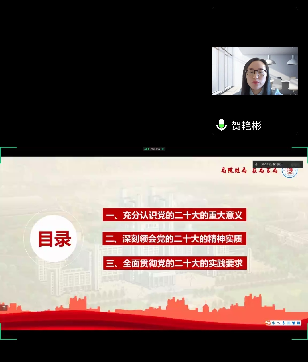 贺艳彬老师从党的二十大主题,深刻领会党的二十大精神实质,过去5年的工作和新时代10年的伟大变革,中国式现代化的战略任务,推动学校事业高质量发展五个方面,对党的二十大精神学习贯彻进行了全面系统、形象生动的宣讲。并详细讲述了党的二十大的主题、重大成果和重大意义。深入讲解了“五个牢牢把握”的精神内涵与指导意义。并就报告中有关“教育、科技、人才是全面建设社会主义现代化国家的基础性、战略性支撑”部署内容进行阐释,强调作为教育系统如何更好的去理解学习贯彻党的二十大报告中关于教育的相关内容,将二十大报告中提出的新思想、新部署、新战略落实到强校建设的具体实践中,推进学校建成“特色鲜明的国内一流理工科大学”,为实现科教兴国战略、人才强国战略、创新驱动发展战略贡献理工人的力量。