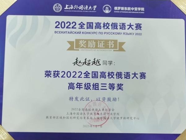 经过 2022 年疫情期间线上初赛的激烈比拼,外国语学院俄语19-2班赵超越同学以初赛全国第4名入围复赛,在决赛中与北京外国语大学、北京第二外国语学院、大连外国语大学、黑龙江大学等名校学生同台竞技,最终荣获 2022 年全国高校俄语大赛高年级组三等奖,决赛成绩位列全国前10,获得留学基金委提供的国家公派留学攻读硕士研究生学位名额。
