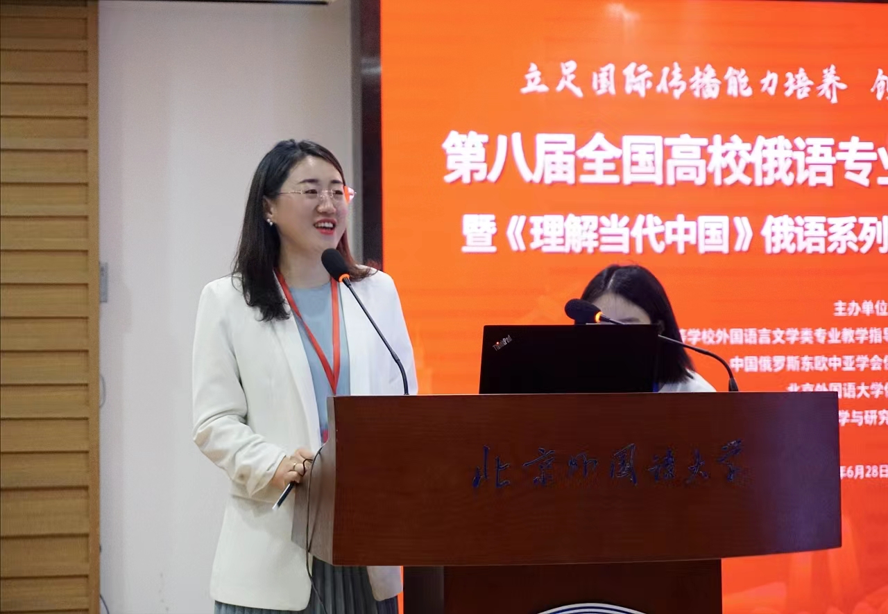 6月29日,第八届全国高校俄语专业教学法学术研讨会暨“理解当代中国”俄语系列教材与课程建设高端论坛在北京外国语大学顺利开幕。本次会议以“立足国际传播能力培养,创新俄语教育发展路径”为主题,由教育部高等学校外国语言文学类专业教学指导委员会俄语专业教学指导分委员会、中国俄罗斯东欧中亚学会俄语教学研究分会、北京外国语大学俄语学院和外语教学与研究出版社共同主办。来自全国近80所高校的140余名俄语教育专家、学者与一线教师齐聚一堂,共同探讨新时代背景下俄语教育改革创新思路,分享教学成果与实践经验,助推俄语教育教学高质量发展。哈尔滨理工大学俄语系党支部书记田欣欣受邀作题为《国家级线上线下混合式一流课程<基础俄语>教学设计与课程建设》的报告。