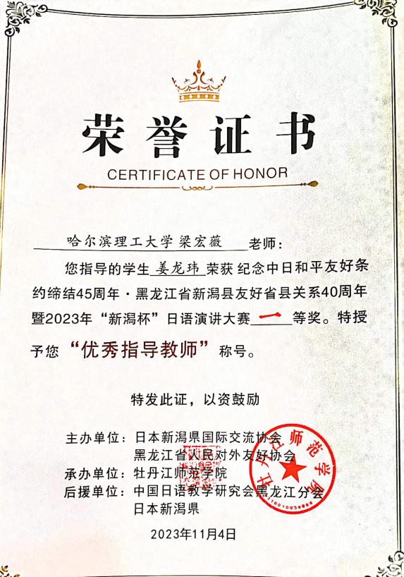 2023年“新潟杯”日语演讲大赛于11月4日在牡丹江师范学院举行。我校参赛选手日语系21级姜龙玮同学在比赛中表现出色,荣获一等奖,受到日本新潟県国际交流协会出资邀请赴日游学一周。外国语学院梁宏薇老师指导并带队参加本次比赛,荣获“优秀指导教师”称号。
