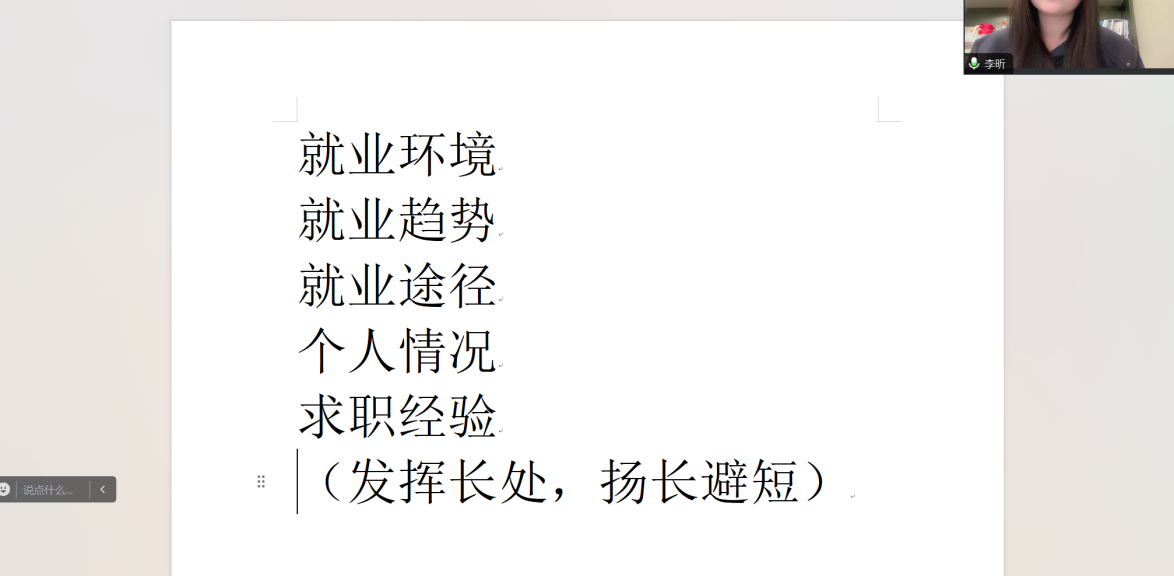 会议中,高英祺分析了同学们面临的就业形势,她强调,面对激烈的就业竞争,希望同学们不打无准备之仗,提前做好充分的准备。随后,四位同学分享了自己的就业经验,提供了一系列有关求职经验、简历优化、面试技巧等方面的信息,帮助大家能更好地应对职场挑战。在四位同学做完就业分享后,张春烨建议同学们更新观念,开拓思路,积极面对,为自身的未来职业生涯做好清晰的规划。