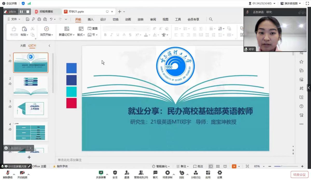 1129日晚英语系针对研究生期中教检过程中学生求职就业方面的诉求,组织开展了线上研究生就业分享会会上邀请了21MTI毕业生高中华、张伊、李昕、邓宇四位同学与英语专业2022级和2023级在校研究生交流就业心得。就业分享会由英语系党支部书记张春烨主持,英语系主任高英祺和专业教师参加会议。