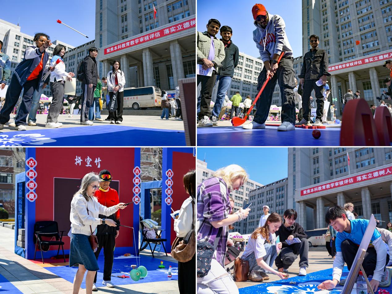 “投壶讲究‘心正体直’,手腕要稳!” 在传统游戏区,中国学生示范投壶要领,来自尼日利亚的留学生迪达姆屏气凝神,将竹箭投入三足壶中时,现场爆发出喝彩声。鲁班锁拆解比赛中,机械工程学院的中外学生组成 “跨国战队”,在榫卯结构的精密咬合间,古老智慧与现代理工思维达成默契;抖空竹的嗡嗡声里,中外学生跟着节奏旋转,衣袂飞扬间,传统游艺成为跨越语言的快乐密码。“原来古人的游戏这么有趣!” 中国学生一边体验捶丸一边感慨,而留学生们则在 “歘嘎拉哈” 的清脆声响中,触摸到中国北方民俗的温度。