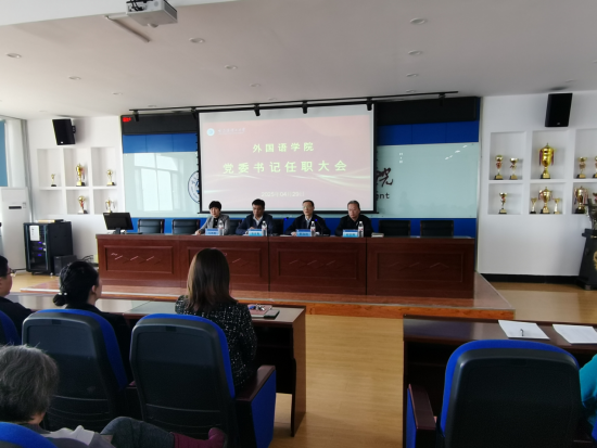 2025 年 4 月 29 日,外国语学院党委书记任职大会在南区740会议室顺利召开。校党委副书记郭加利出席会议并讲话,外国语学院院班子领导及无课教职工参会,会议由组织部副部长张岩青主持。