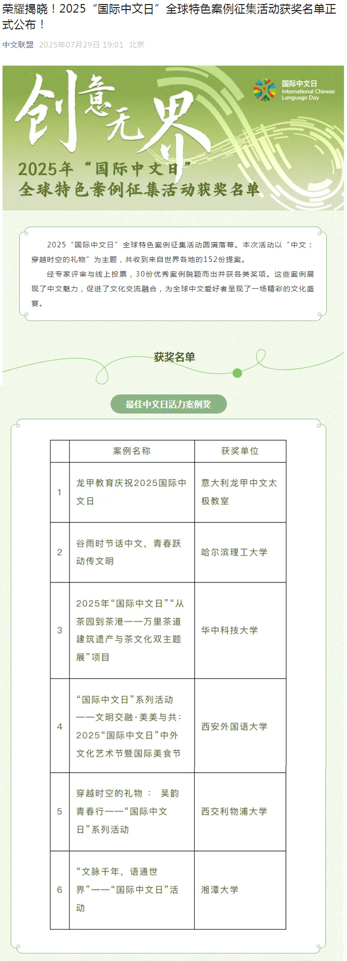 近日,由中文联盟主办的以“中文:穿越时空的礼物”为主题的2025“国际中文日”全球特色案例征集活动落下帷幕。活动设立五大特色奖项,为各类优秀案例搭建了专属的展示平台。本次活动主办方共收到来自世界各地的152份创意提案,经过专家评审的专业考量与线上大众的热情投票,30份兼具创意与实效的优秀案例从中脱颖而出,并分获各类奖项。其中,外国语学院4月20日在新主楼前广场举办的国际中文日活动案例——“谷雨时节话中文,青春跃动传文明”凭借独特的活动设计、浓厚的文化氛围和师生的广泛参与度,成功斩获“最佳中文日活力案例奖”。