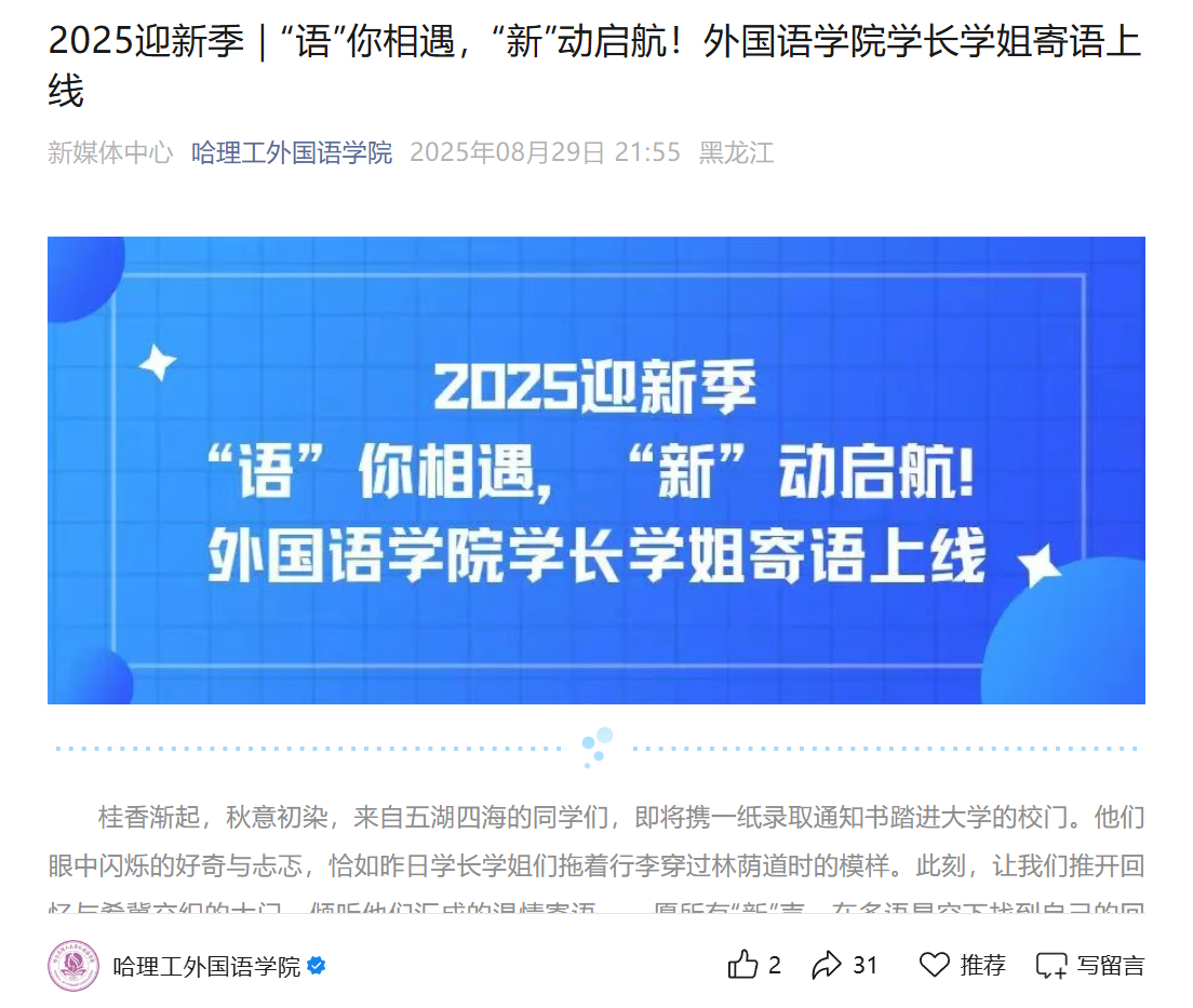 祝愿2025级外院学子能带着入学教育的收获,以理想为帆、以奋斗为桨,在哈尔滨理工大学的沃土上,成长为兼具语言专长与家国担当的时代新人,书写属于自己的青春华章!