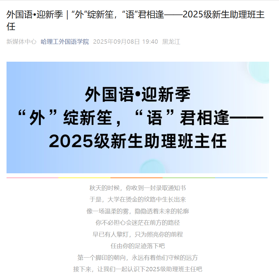 祝愿2025级外院学子能带着入学教育的收获,以理想为帆、以奋斗为桨,在哈尔滨理工大学的沃土上,成长为兼具语言专长与家国担当的时代新人,书写属于自己的青春华章!