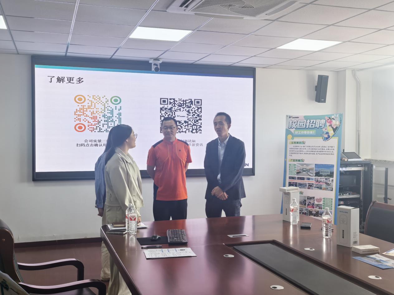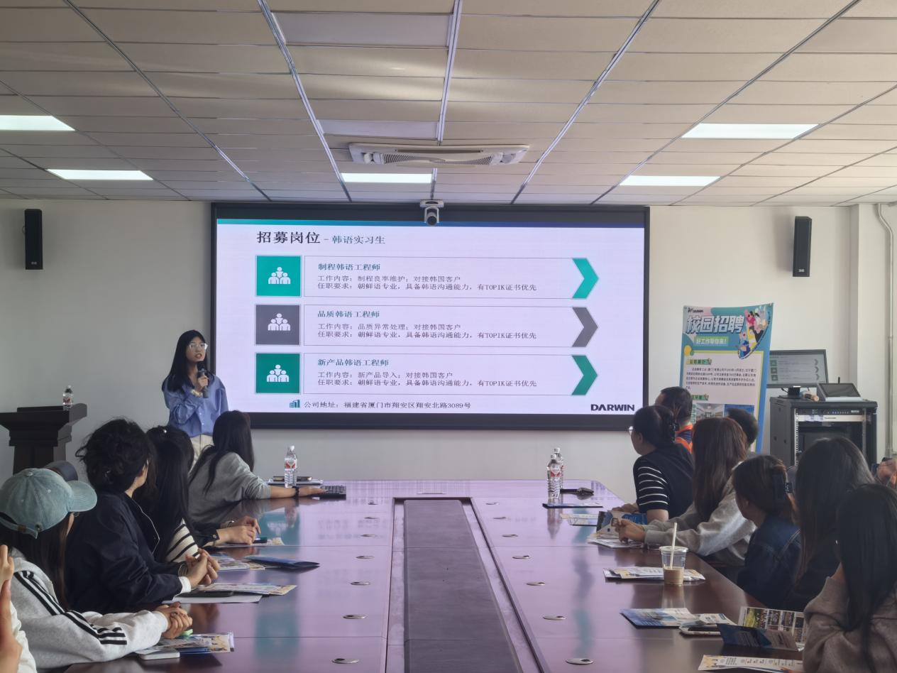 9月19日,外国语学院于南区1号楼618室举办厦门达运精密科技有限公司专场招聘宣讲会。公司生产支援课副理房丽霞(外国语学院朝鲜语2009届毕业生)、人力资源课管理师刘丽君,外国语学院党委副书记张宏亮、朝鲜语系主任车虎杰、2026届毕业生辅导员贾昊鹏及2026届朝鲜语系全体学生参加了本次宣讲活动。
