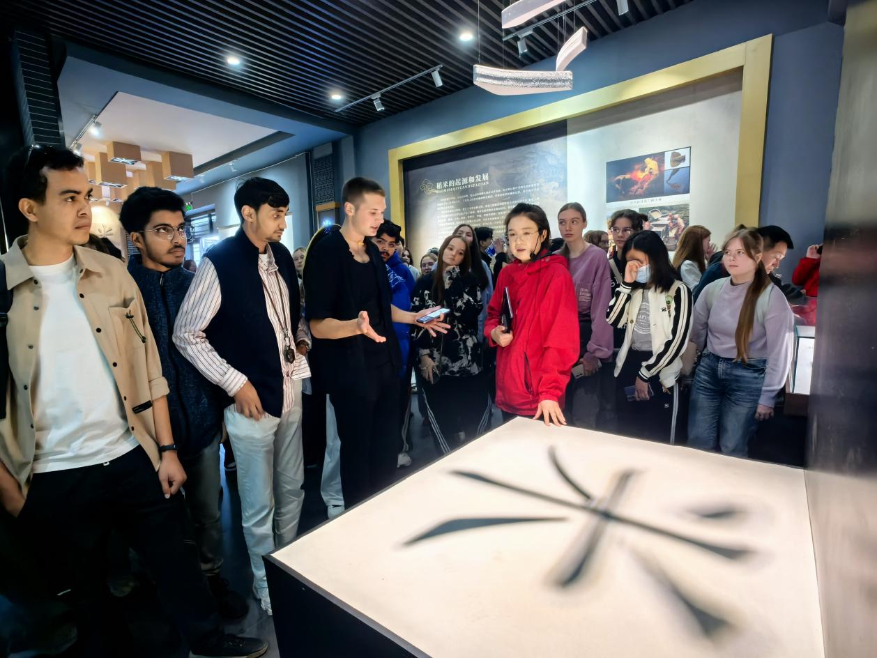 活动首站,学生们来到乔府大院现代农业产业园内的大米博物馆。馆内展示了中国水稻种植起源、农具及世界大米种植分布格局,使留学生对稻米产业有了初步的宏观认知。360度投影展区,将五常地区的黑土构成、气候特征、水源条件等关键要素生动呈现,随着光影流转,留学生们真正明白了 “为何这片土地能够孕育出优质的水稻”。现场工作人员还贴心准备了用五常稻米制作的米汁与米饭。清甜的米香、软糯的口感,赢得了留学生们的频频点头与称赞。