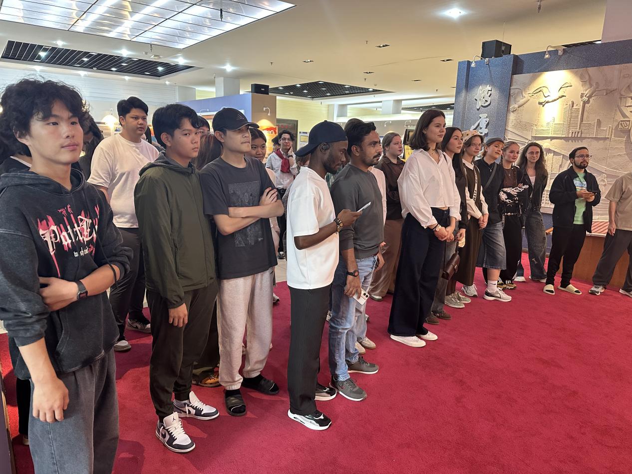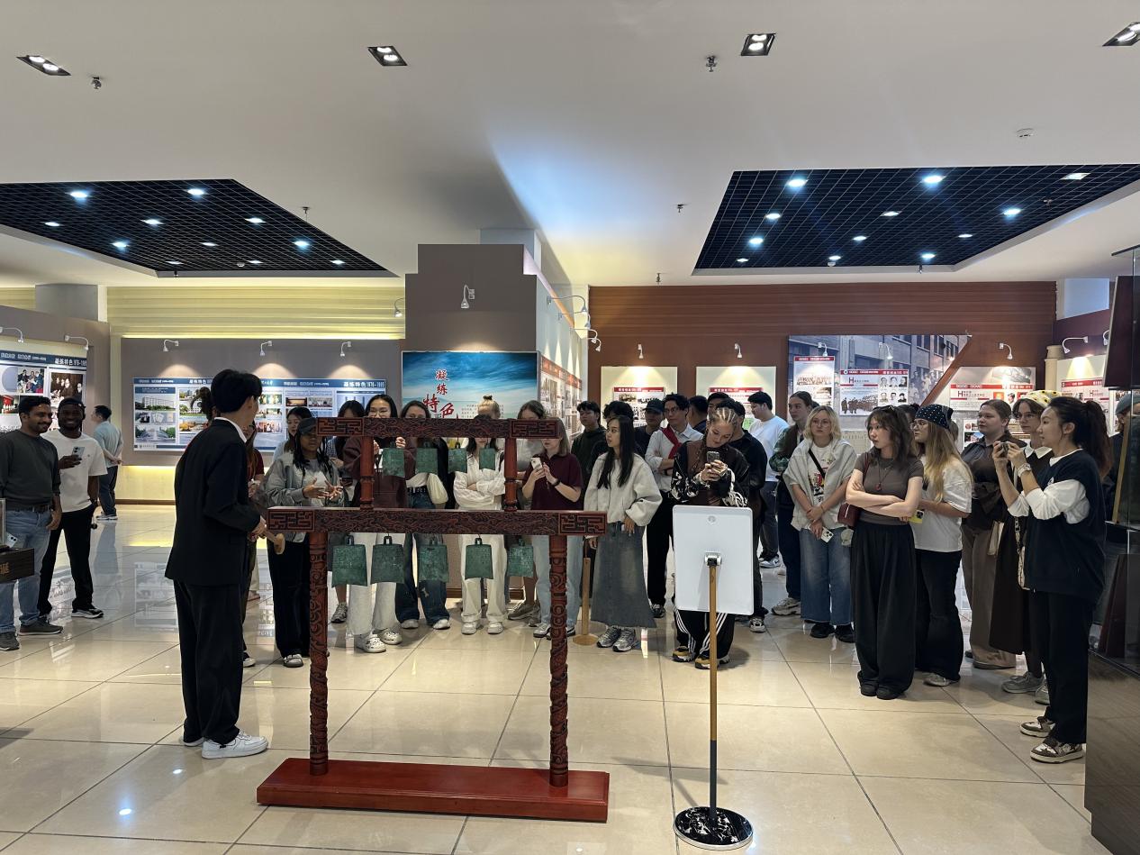 在参观过程中,留学生们专注聆听讲解,不时停下脚步,仔细观看展柜内的展品及图片资料,从而对学校形成了更为深刻且全面的认知。其中,被誉为“镇馆之宝”的复刻编钟,格外吸引留学生们的目光。当得知这组编钟是学校凭借专业技术复刻而来时,留学生们不仅更直观地领略到中国传统乐器的魅力,也切实感受到了学校的专业实力。