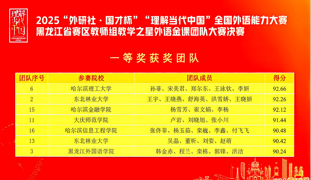 近日,2025“外研社·国才杯”“理解当代中国”全国外语能力大赛黑龙江省赛区获奖名单公布,我校师生在各项赛事中表现亮眼,学生组共荣获金奖7项、银奖6项、铜奖9项,其中金奖选手将代表黑龙江省赛区出征本年度全国总决赛;在教师组比赛中,外国语学院大学外语教学部孙菲、宋美君团队凭借《大学英语》课程的精彩展示,夺得黑龙江省赛区决赛一等奖,英语系魏智男、田凌云团队获得省赛三等奖。