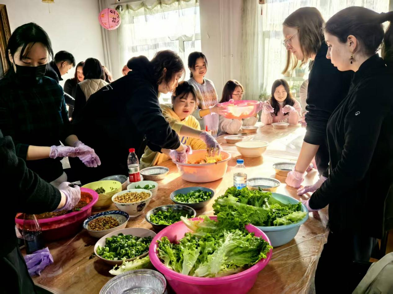 文化体验与实践环节,为学生们开启多元探索之旅。走进冰雪大世界,冰雕奇景流光溢彩,冰砌城堡与璀璨灯光交相辉映,冰滑梯的极速俯冲、雪地漫步的静谧惬意,让同学们沉醉于北国冬日的梦幻浪漫;参与冰壶体验,在专业指导下握壶、瞄准、刷冰,在协作竞技间感受“冰上国际象棋”的智慧与乐趣,解锁东北冰雪运动的独特魅力;探访敷尔佳科技有限公司,智能化生产线与研发实验室尽显科创力量,从原料筛选到成品检测,直观感受中国企业的严谨与创新。此外,扎染课堂上,绳结捆扎间晕染出独一无二的斑斓纹样;活字印刷体验中,字模排布间复刻千年文明智慧;篆刻创作里,刻刀起落间雕琢方寸间的匠心神韵;包饺子时,围坐畅谈揉面包馅,在烟火氤氲中品味团圆寓意;做东北饭包时,生菜裹着鲜香食材,一口下去满是地道风味,多元活动在他们舌尖与心间,留存下深刻而独特的中国记忆。