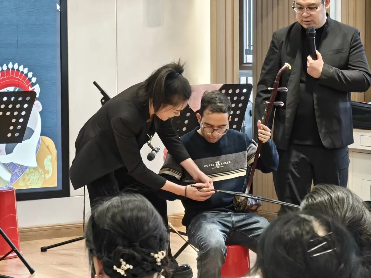 为让留学生深入体验中国传统文化,活动设置趣味互动环节,将“听音乐”变为“玩音乐”,成活动亮点。在“乐器演奏体验区”,演奏家指导留学生演奏竹笛、二胡、锣鼓等传统乐器。俄罗斯的安娜吹出竹笛音符,虽生涩却获掌声;萨尔瓦多的达夫拉二胡,惊叹于旋律婉转;锣鼓区热闹,留学生敲板鼓与铙钹,感受中国戏曲“精气神”。“工尺谱识读与学唱”环节也很精彩,著名戏曲演员刘妍彤教学,带留学生认识工尺谱、讲解含义,学唱《牡丹亭・游园》经典唱段《皂罗袍》。留学生兴致高,模仿发音与腔调,现场掌声笑声交织,气氛达高潮。
