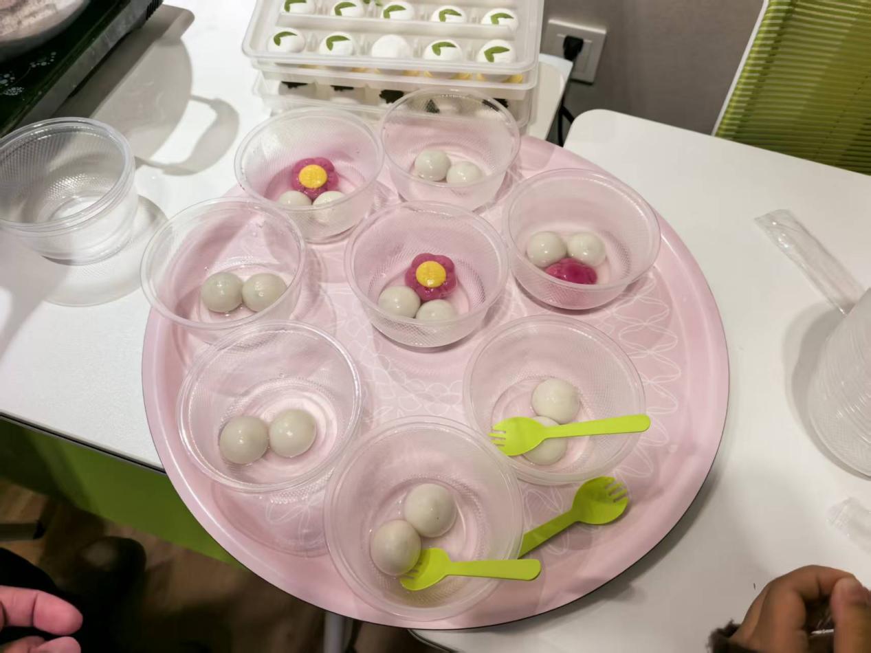 演出与互动环节结束,“共品元宵”环节如期而至。工作人员端上热气腾腾的元宵,摆满了黑芝麻、豆沙、花生等经典口味。老师们向留学生介绍元宵节吃元宵寓意“团圆美满、甜甜蜜蜜”。留学生好奇地拿起勺子品尝,软糯外皮与香甜馅料获大家称赞。