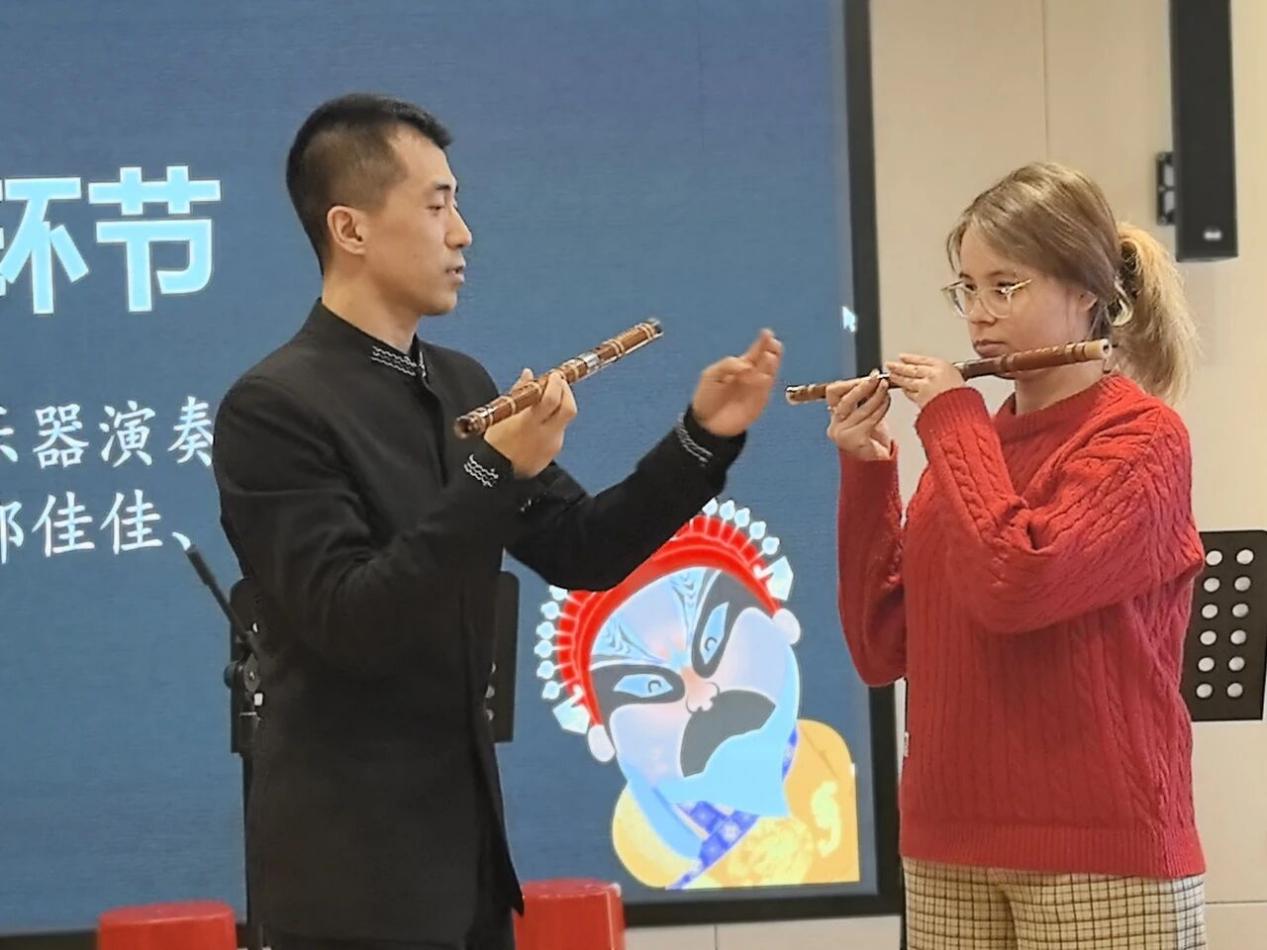 为让留学生深入体验中国传统文化,活动设置趣味互动环节,将“听音乐”变为“玩音乐”,成活动亮点。在“乐器演奏体验区”,演奏家指导留学生演奏竹笛、二胡、锣鼓等传统乐器。俄罗斯的安娜吹出竹笛音符,虽生涩却获掌声;萨尔瓦多的达夫拉二胡,惊叹于旋律婉转;锣鼓区热闹,留学生敲板鼓与铙钹,感受中国戏曲“精气神”。“工尺谱识读与学唱”环节也很精彩,著名戏曲演员刘妍彤教学,带留学生认识工尺谱、讲解含义,学唱《牡丹亭・游园》经典唱段《皂罗袍》。留学生兴致高,模仿发音与腔调,现场掌声笑声交织,气氛达高潮。
