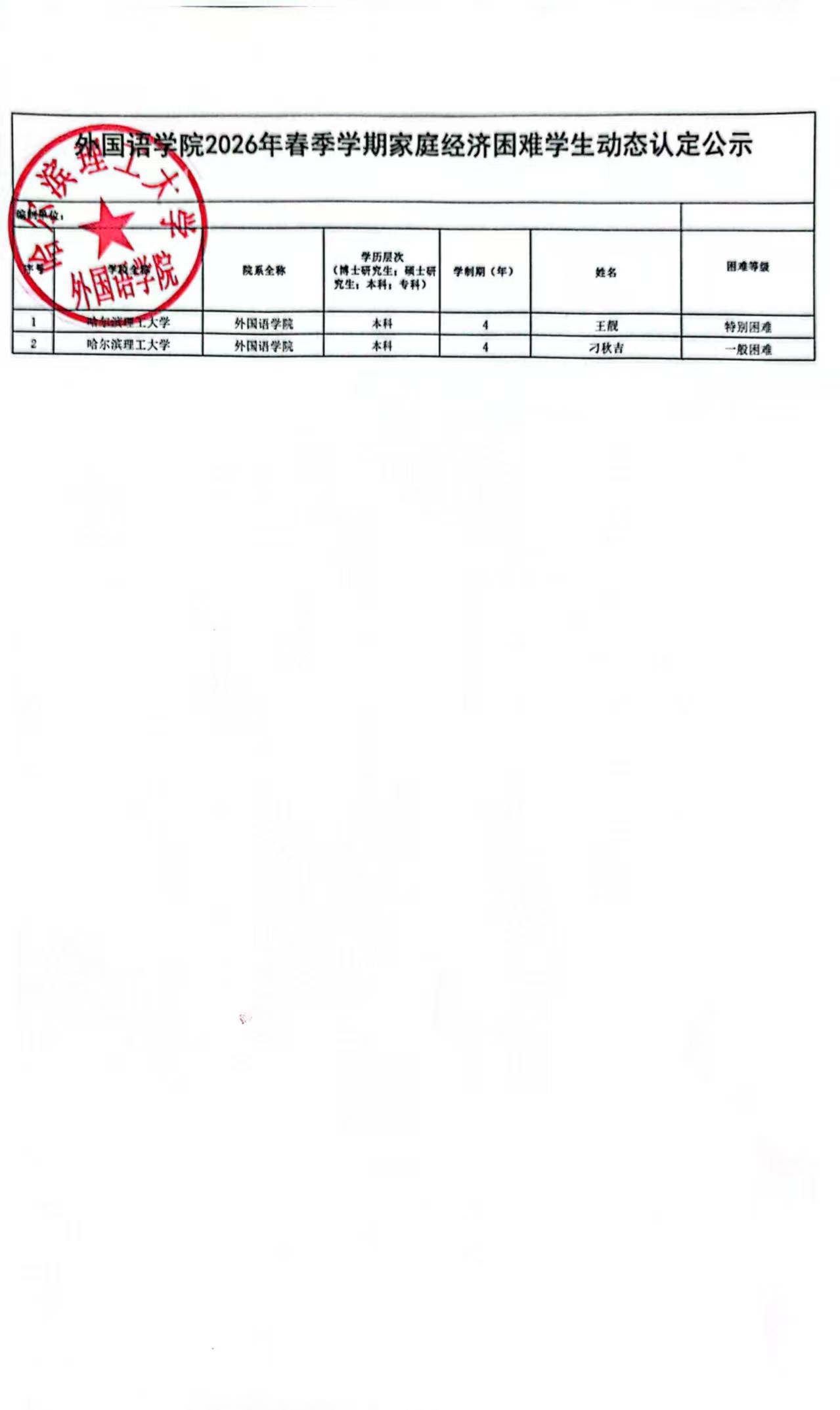 根据《教育部等六部门关于做好家庭经济困难学生认定工作的指导意见》(教财〔2018〕16号)、《黑龙省家庭经济困难学生认定办法》(黑教规[2019]9号)等文件有关家庭经济困难学生动态认定管理的工作要求等文件精神,结合我院实际,按照要求,经个人申报、班级资助评议小组评审、学院资助工作小组评审、学院资助领导小组讨论通过,认定王靓等2名同学为家庭经济困难学生,名单见附件。