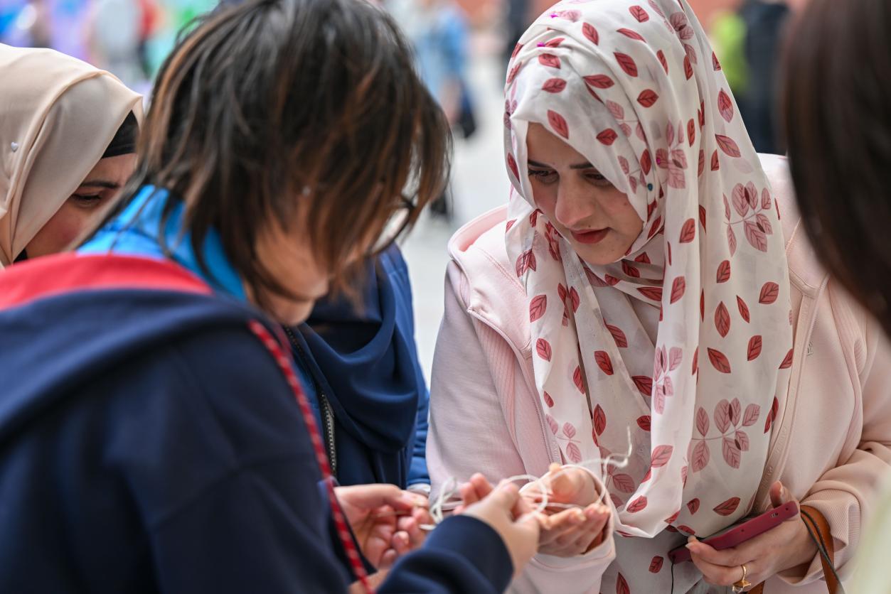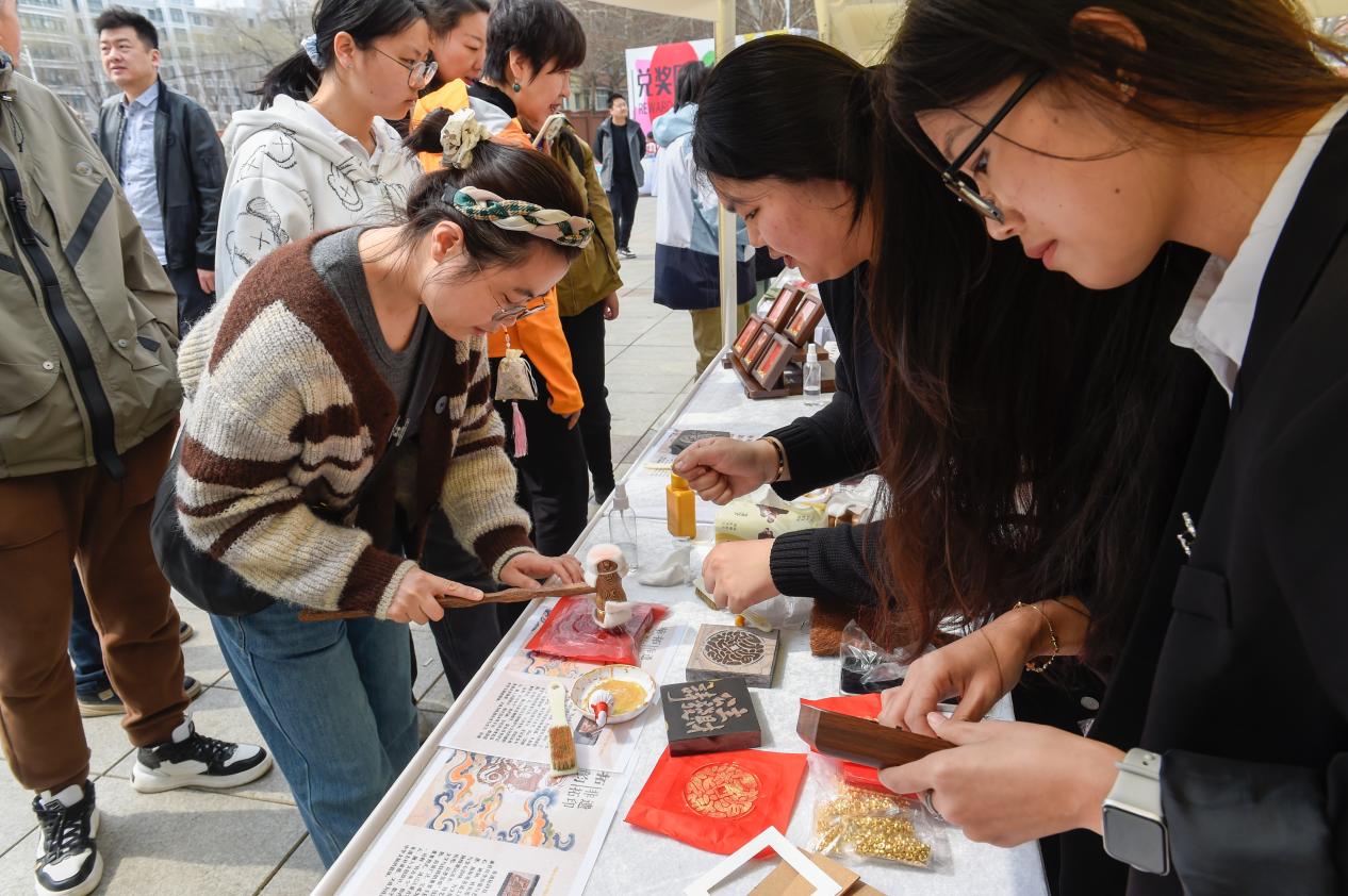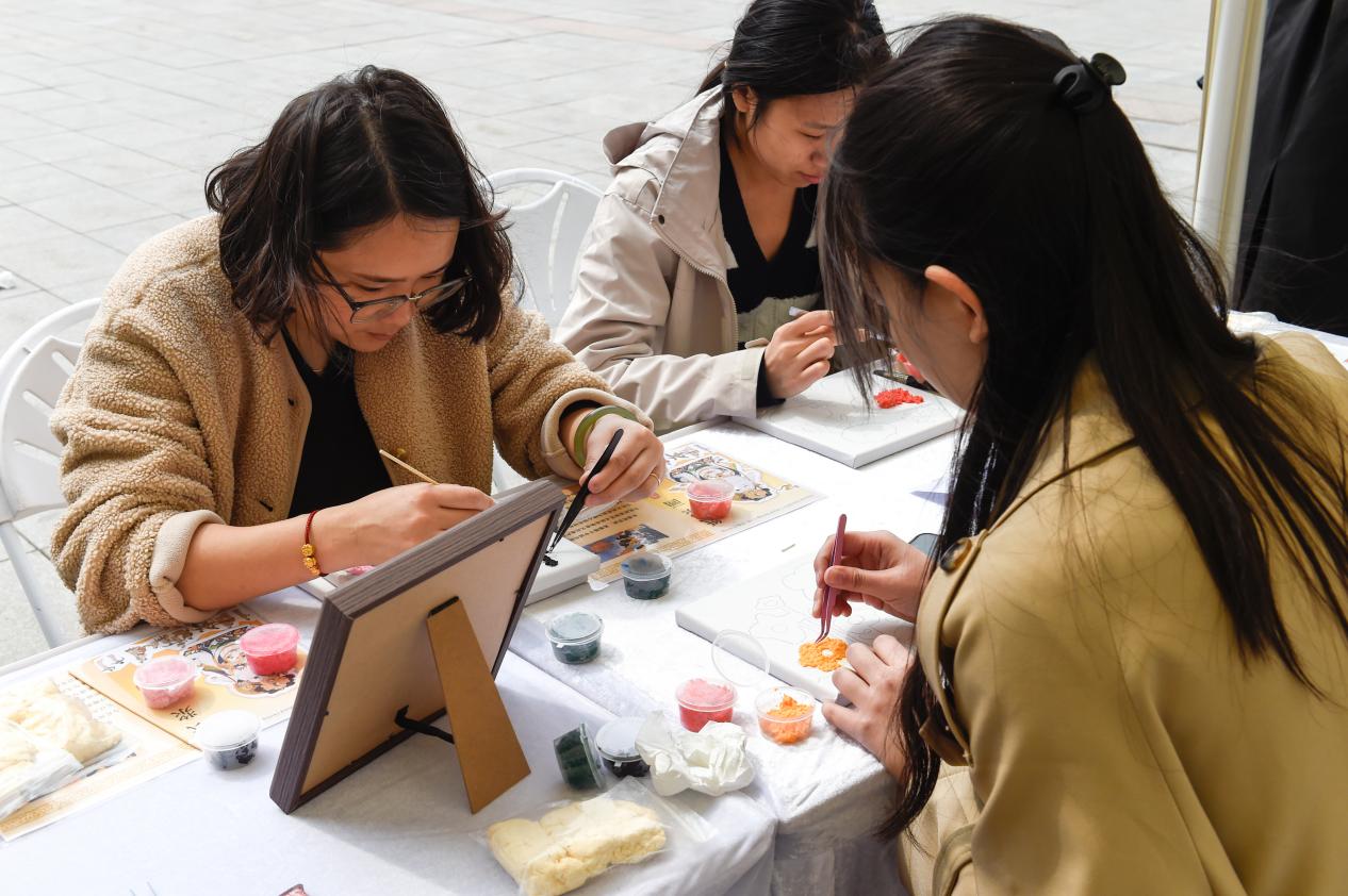 非遗体验区,成为中外文化交融的核心阵地。盘扣胸针、点翠、刺绣、中国结、掐丝珐琅、缠花、剪纸、中药香囊、木版水印(生肖年画)、传统发簪制作、手工布艺、纸浆画、泥塑紫砂摆件、糖画等14项非遗体验项目琳琅满目,令人目不暇接。在传承人与志愿者的指导下,中外学生纷纷动手体验:指尖翻飞间,五彩丝线化作精巧的中国结;轻捏慢塑中,一团团彩泥变成了憨态可掬的生肖摆件;铜丝弯折、釉料填充,一件件精美的掐丝珐琅作品初具雏形;更有同学亲身体验了木版水印,当一张印有自己属相的年画带着墨香跃然纸上时,现场充满了惊喜与赞叹。这些指尖上的艺术,让千年技艺变得可感可知,也让文化的种子在心田悄然播下。